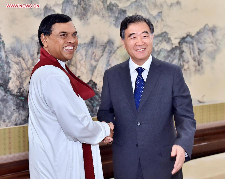 | Chinese Vice Premier Wang Yang (R) meets with Sri Lanka's Economic Development Minister Basil Rajapakse in Beijing, capital of China, July 2, 2014. (Xinhua/Li Tao) |