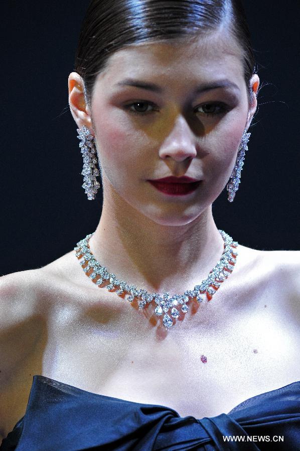 A model presents jewelry creations at a fashion show during the Singapore International Jewelry Expo held in Singapore's Marina Bay Sands Expo, on July 3, 2014. The four-day Singapore International Jewelry Expo kicked off here Thursday. (Xinhua/Then Chih Wey)