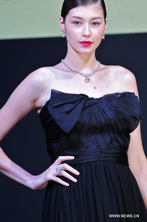 A model presents jewelry creations at a fashion show during the Singapore International Jewelry Expo held in Singapore's Marina Bay Sands Expo, on July 3, 2014. The four-day Singapore International Jewelry Expo kicked off here Thursday. (Xinhua/Then Chih Wey)