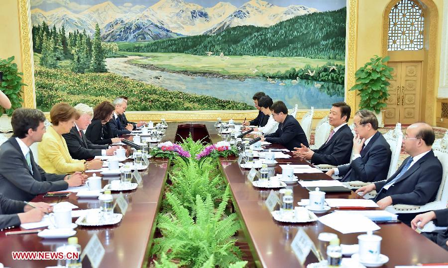 | Chinese Vice President Li Yuanchao (3rd R) meets with an European delegation of European journalists and scholars led by Pierre Defraigne (3rd L), executive director of the Madariaga - College of Europe Foundation, in Beijing, China, July 3, 2014. (Xinhua/Li Tao) |