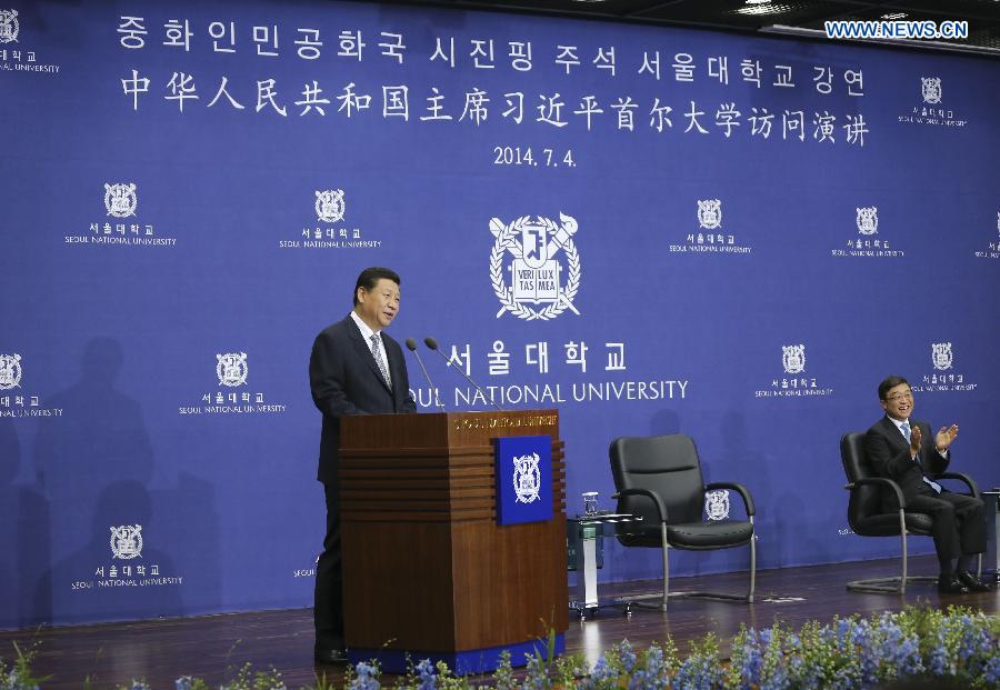 Chinese President Xi Jinping delivers a speech at Seoul National University in Seoul, capital of South Korea, July 4, 2014. (Xinhua/Lan Hongguang)