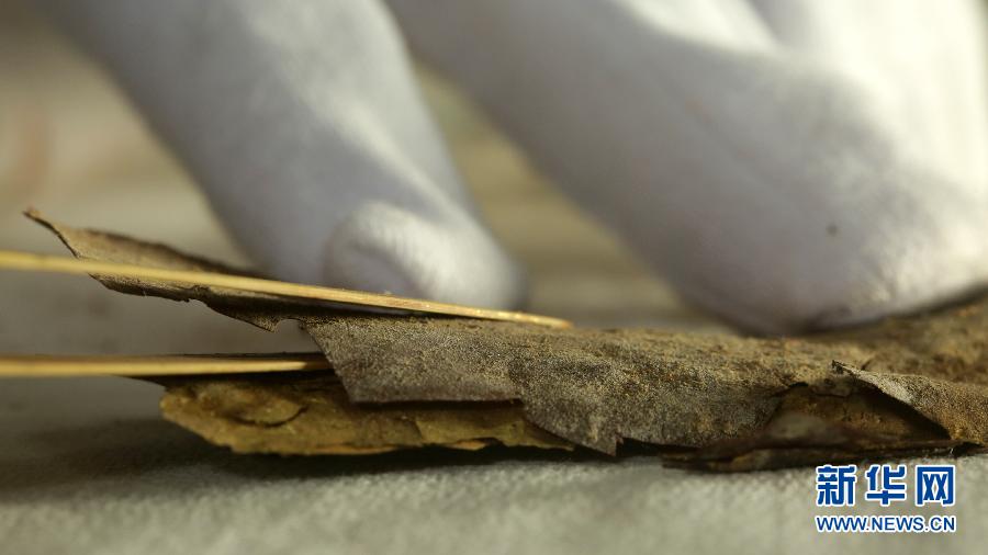 Specialists stratify the previous multi-layered gold from the statue of the thousand-armed Buddha on Baoding Mountain in Southwest China’s Chongqing municipality on June 16, 2014. (Photo/ Luo Guojia)