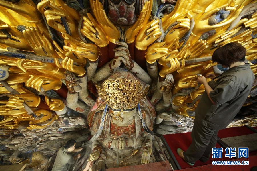 The statue, one integral part of the Dazu Rock Carvings, which are designated as a World Heritage Site, was originally carved in the Song Dynasty (960-1279). The conservation project was initially launched on April 18, 2011 and is expected to be completed in the first half of 2015.>>>Facial mask for centuries-old Buddha: restoring project