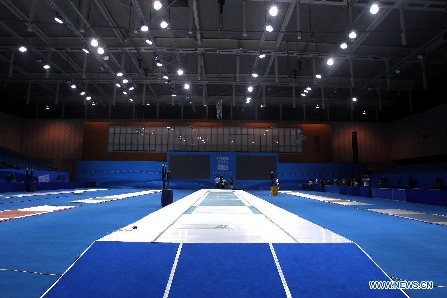 Picture taken on July 4, 2014 shows the interior of the fencing venue for the Nanjing 2014 Youth Olympic games in Nanjing, capital of east China's Jiangsu Province. The Nanjing 2014 Youth Olympic games will be held from August 16 to 28, attracting 3808 youth athletes from 204 countries and regions. (Xinhua/Gao Jing)