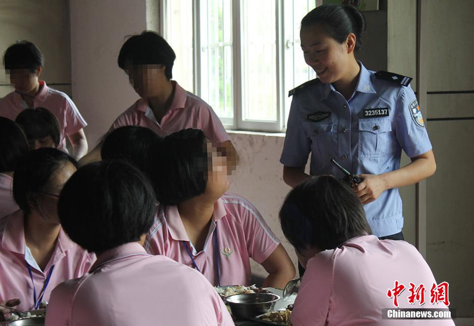 Tang talks with a recovering addict during lunch at 11:40 a.m. in the female compulsory rehabilitation center in east China's Jiangsu province. (Chinanews.com/Su Shifa)
