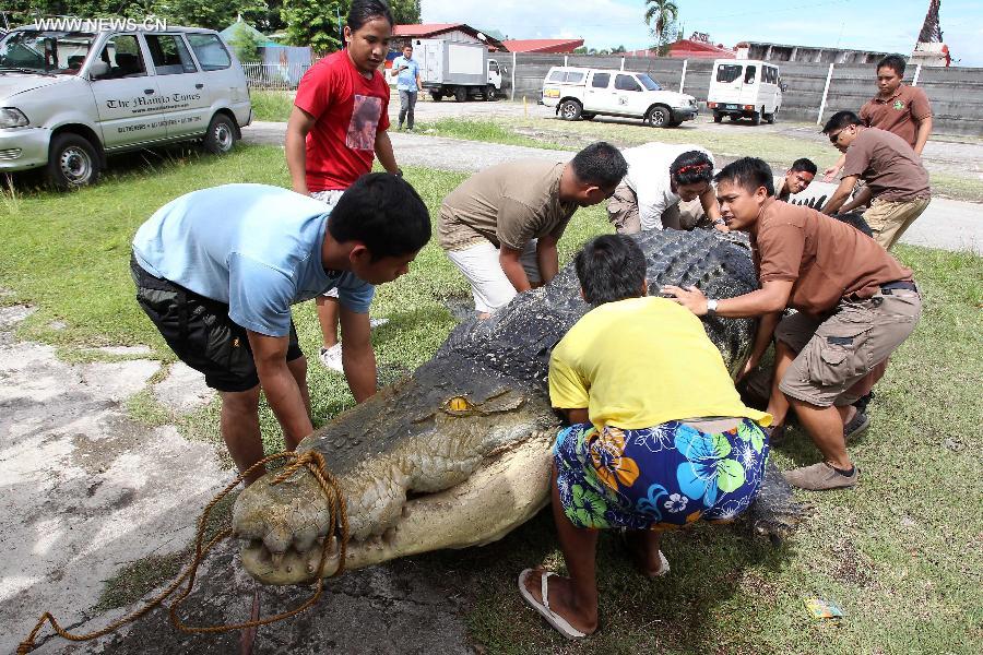 Workers carry "Longlong", a 21-foot robot crocodile from a truck at the Crocodile Park in Pasay City, the Philippines, July 5, 2014. The robot crocodile, costing around 80,000 pesos, or 1,818 U.S. dollars, is inspired by a giant saltwater crocodile, the longest crocodile on the earth, which died while in captivity in southern Philippines in 2013. (Xinhua/Rouelle Umali)