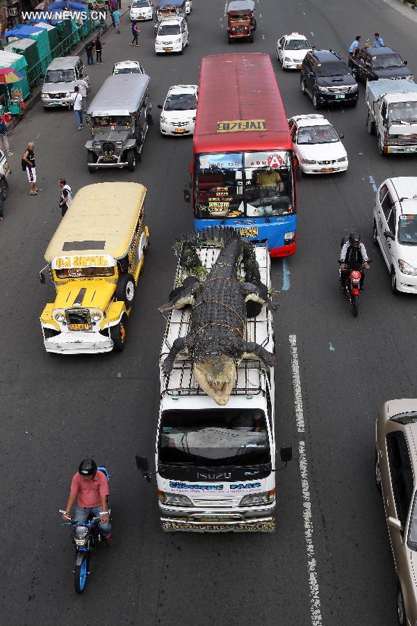 | "Longlong", a 21-foot robot crocodile, is on the way to the Crocodile Park in Pasay City, the Philippines, July 5, 2014. The robot crocodile, costing around 80,000 pesos, or 1,818 U.S. dollars, is inspired by a giant saltwater crocodile, the longest crocodile on the earth, which died while in captivity in southern Philippines in 2013. (Xinhua/Rouelle Umali) |
