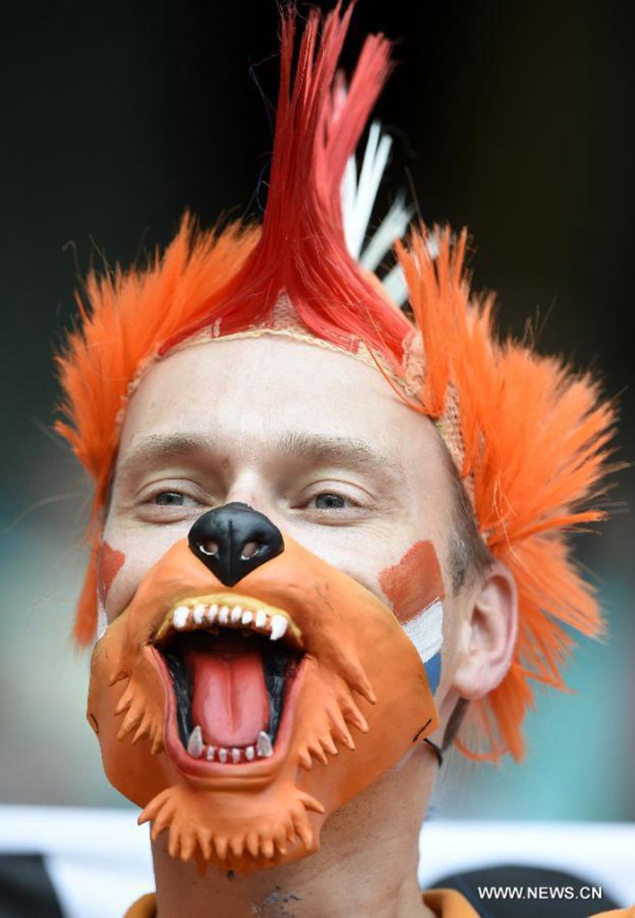 A Netherlands's fan poses before a quarter-finals match between Netherlands and Costa Rica of 2014 FIFA World Cup at the Arena Fonte Nova Stadium in Salvador, Brazil, on July 5, 2014.(Xinhua/Lui Siu Wai)