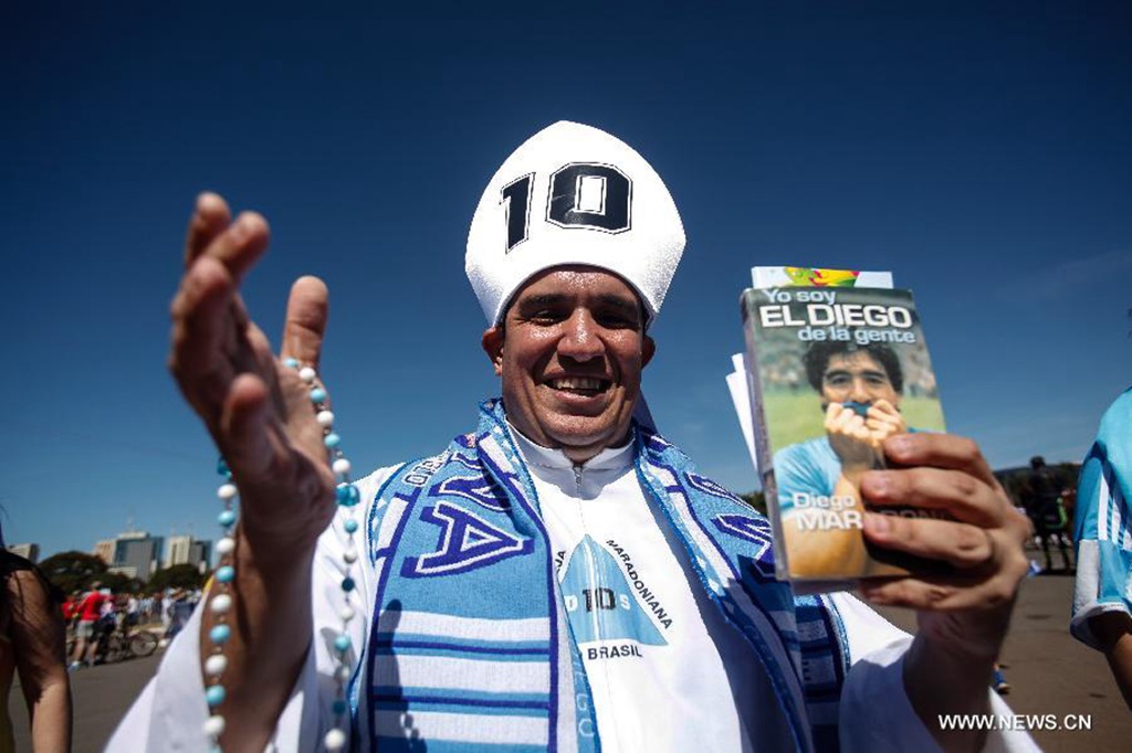 An Argentina's fan poses before a quarter-finals match between Argentina and Belgium of 2014 FIFA World Cup in Brasilia, Brazil, on July 5, 2014.(Xinhua/Jhon Paz)