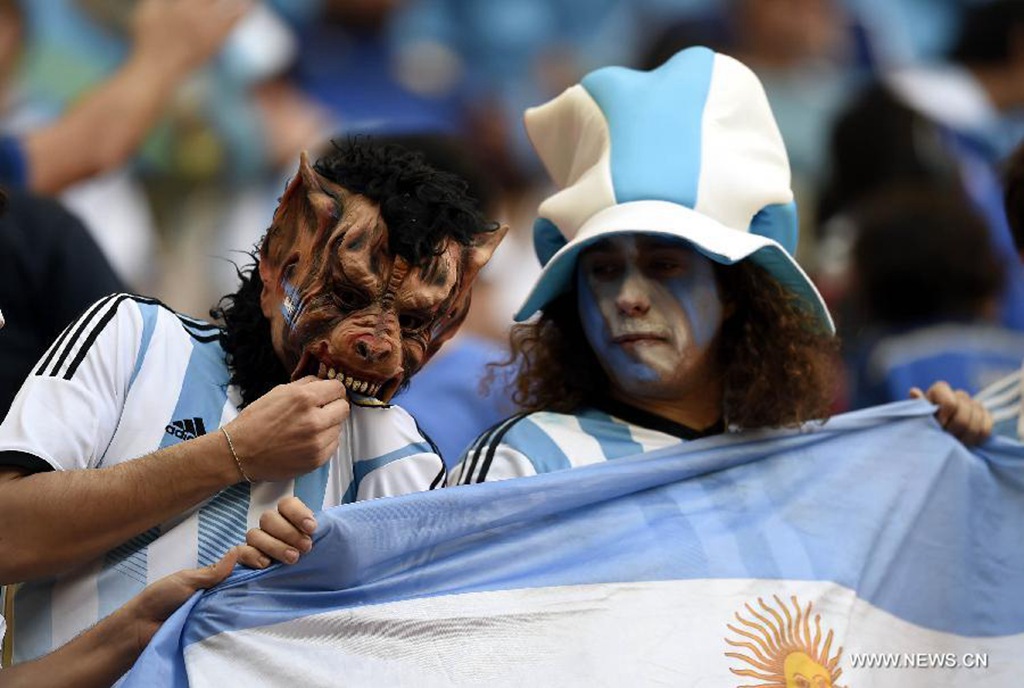 Argentina's fans pose before a quarter-finals match between Argentina and Belgium of 2014 FIFA World Cup at the Estadio Nacional Stadium in Brasilia, Brazil, on July 5, 2014.(Xinhua/Qi Heng)