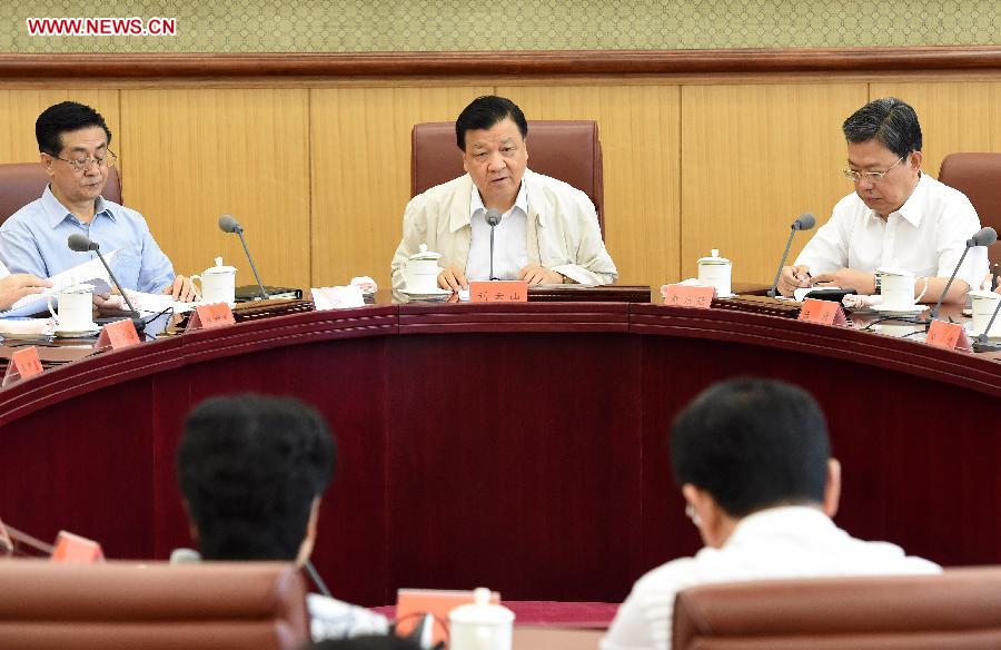 Liu Yunshan (C), a Standing Committee member of the Political Bureau of the Communist Party of China (CPC) Central Committee, presides over a meeting of the leading group of the Party's ongoing "mass-line" campaign in Beijing, China, July 5, 2014. (Xinhua/Liu Jiansheng)