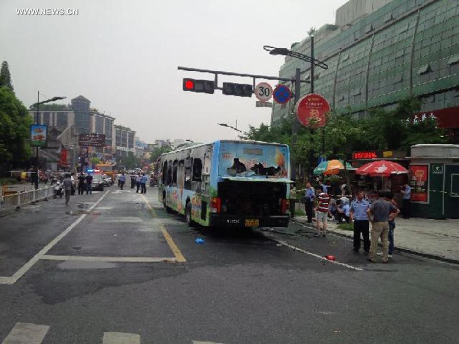 Police cordon off the site where a bus was in flames in Hangzhou, capital of east China's Zhejiang Province, July 5, 2014. Witnesses say some people aboard were injured and sent to hospital. Local police is investigating on the spot and the reason of the fire is still unknown. There was no death report yet. (Xinhua/Han Chuanhao)