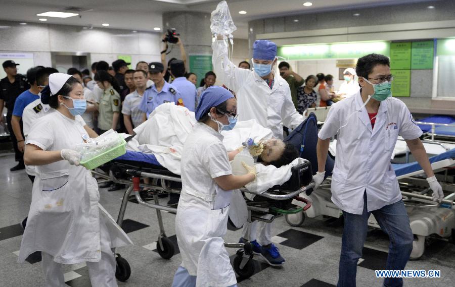 An injured is wheeled to another hospital after first aid at Hangzhou First People's Hospital in Hangzhou, east China's Zhejiang Province, July 5, 2014. Thirty-two injured people were sent to hospitals after a bus caught fire on Saturday afternoon in downtown Hangzhou. No death case has been reported. The cause of the blaze is being investigated. (Xinhua/Ju Huanzong)