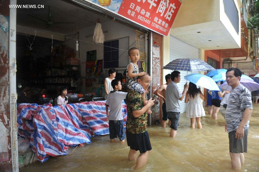 People stand in flood water in Mashan County, south China's Guangxi Zhuang Autonomous Region, July 5, 2014. Torrential rain hit Guangxi since July 4, where the precipitation exceeded 100 mm in 21 counties. (Xinhua/Zhang Ailin)