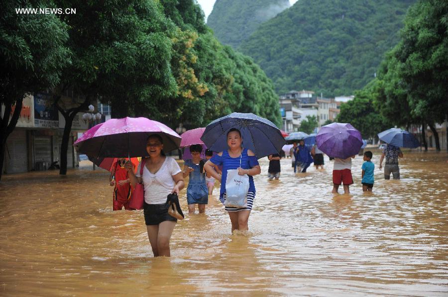 People leave for safe places in Mashan County, south China's Guangxi Zhuang Autonomous Region, July 5, 2014. Torrential rain hit Guangxi since July 4, where the precipitation exceeded 100 mm in 21 counties. (Xinhua/Zhang Ailin)