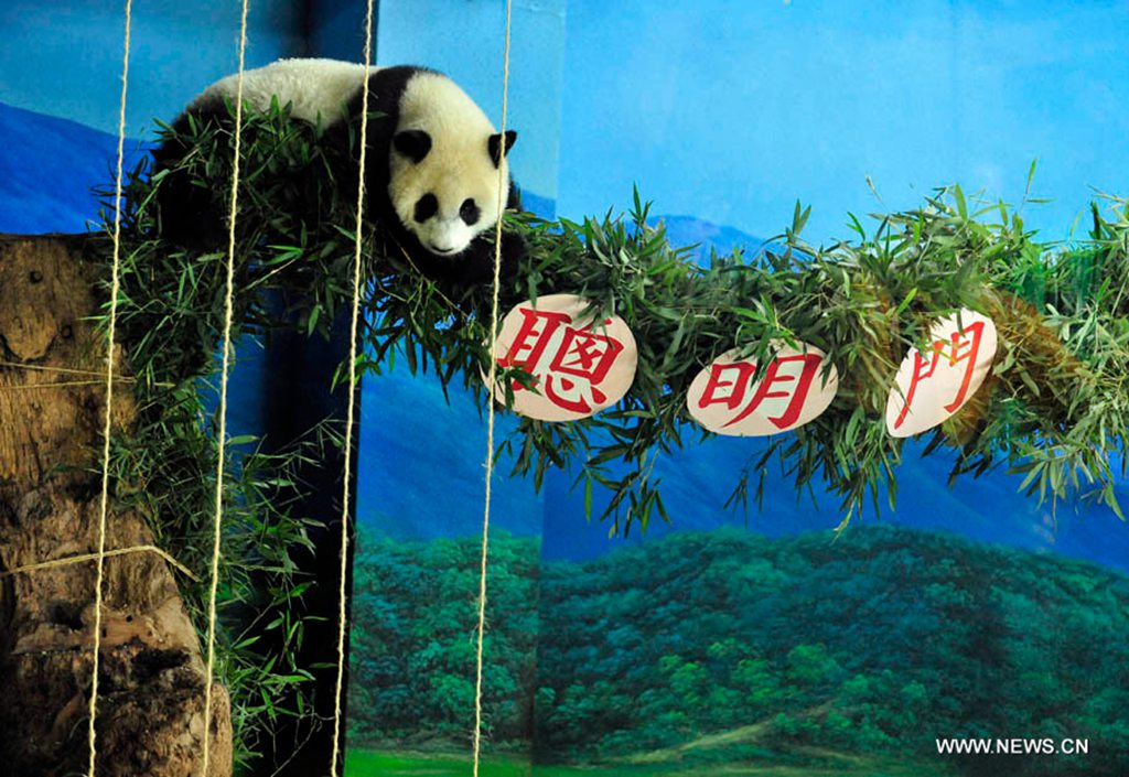 Giant panda "Yuanzai"climbs "smart door" on its first birthday at the Taipei Zoo inTaipei, southeast China's Taiwan, July 6, 2014. (Xinhua/WuChing-teng)