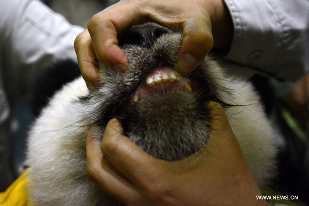 Veterinarians give giant panda "Yuanzai" a physical check before its first birthday at the Taipei Zoo in Taipei, southeast China's Taiwan, July 3, 2014.(Xinhua/Taipei Zoo)