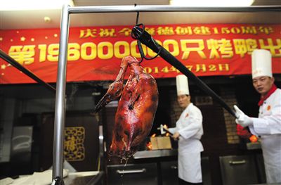 A ceremony for the 150th anniversary of Quanjude Beijing Roast Duck Restaurant is held at its Qianmen Store in Beijing, July 2, 2014. Quanjude, which is known for its longstanding culinary heritage since its establishment in 1864 at Qianmen in Beijing, embraced its 150th anniversary; a ceremony to celebrate its 196 millionth roast duck was also held here. At the same time, the first domestic roast duck exhibition was officially opened to public for free.