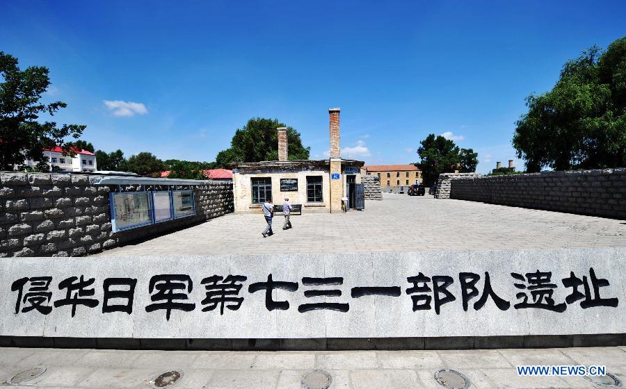 Photo taken on July 7, 2014 shows the entrance to the site of the Japanese Unit 731 troop in Harbin, capital of northeast China's Heilongjiang Province. Unit 731 was a biological and chemical warfare troop set up in China by the Japanese invaders during World War II. The Unit 731 site's core area, which consists of a bacteria lab and a prison used to keep people for biological experiments, is going through a clearing process that will be finished by October 2014. The core area will be open to the public around the 70th anniversary of China's victory in World War II and the Chinese People's War of Resistance Against Japanese Aggressions in 2015. (Xinhua/Wang Jianwei)