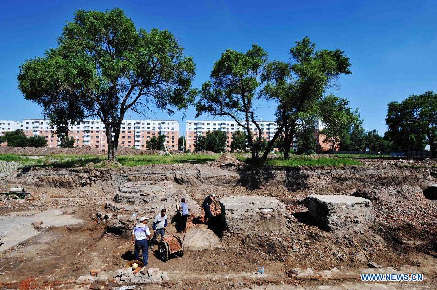 Workers conduct clearing work in the core area of the site of the Japanese Unit 731 troop in Harbin, capital of northeast China's Heilongjiang Province, July 7, 2014. Unit 731 was a biological and chemical warfare troop set up in China by the Japanese invaders during World War II. The clearing process in the Unit 731 site's core area, which consists of a bacteria lab and a prison used to keep people for biological experiments, will be finished by October 2014 and open to the public around the 70th anniversary of China's victory in World War II and the Chinese People's War of Resistance Against Japanese Aggressions in 2015. (Xinhua/Wang Jianwei)