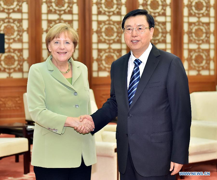 Zhang Dejiang (R), chairman of the Standing Committee of China's National People's Congress, shakes hands with German Chancellor Angela Merkel in Beijing, capital of China, July 7, 2014. (Xinhua/Li Tao)