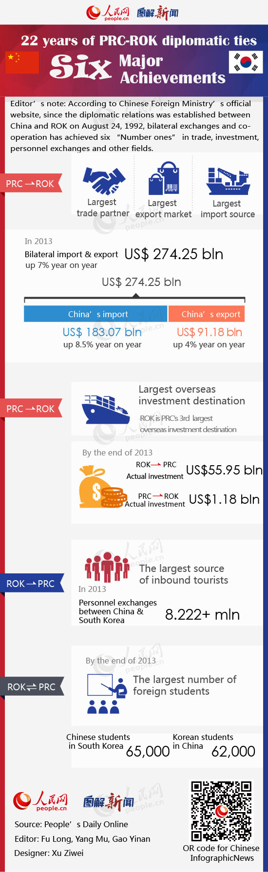According to Chinese Foreign Ministry’s official website, since the diplomatic relations was established between China and ROK on August 24, 1992, bilateral exchanges and cooperation has achieved six “Number ones” in trade, investment, personnel exchanges and other fields.
