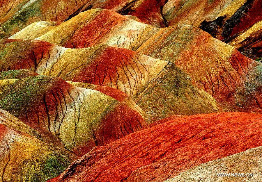Photo taken on July 7, 2014 shows the scenery at Zhangye Danxia Landform Geological Park in Zhangye City, northwest China's Gansu Province. Danxia, which means "rosy cloud", is a special landform formed from reddish sandstone that has been eroded over time into a series of mountains surrounded by curvaceous cliffs and many unusual rock formations. (Xinhua/Wang Song)