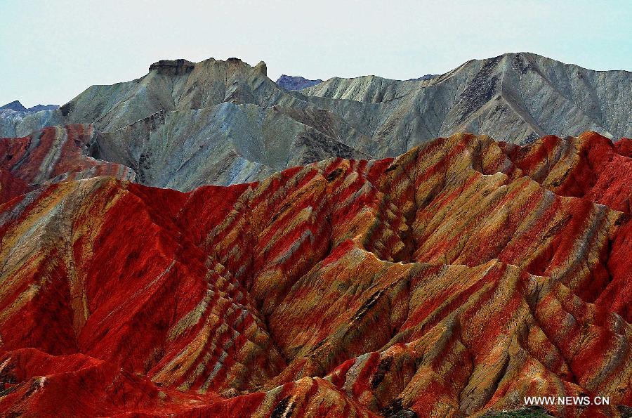 Photo taken on July 7, 2014 shows the scenery at Zhangye Danxia Landform Geological Park in Zhangye City, northwest China's Gansu Province. Danxia, which means "rosy cloud", is a special landform formed from reddish sandstone that has been eroded over time into a series of mountains surrounded by curvaceous cliffs and many unusual rock formations. (Xinhua/Wang Song)
