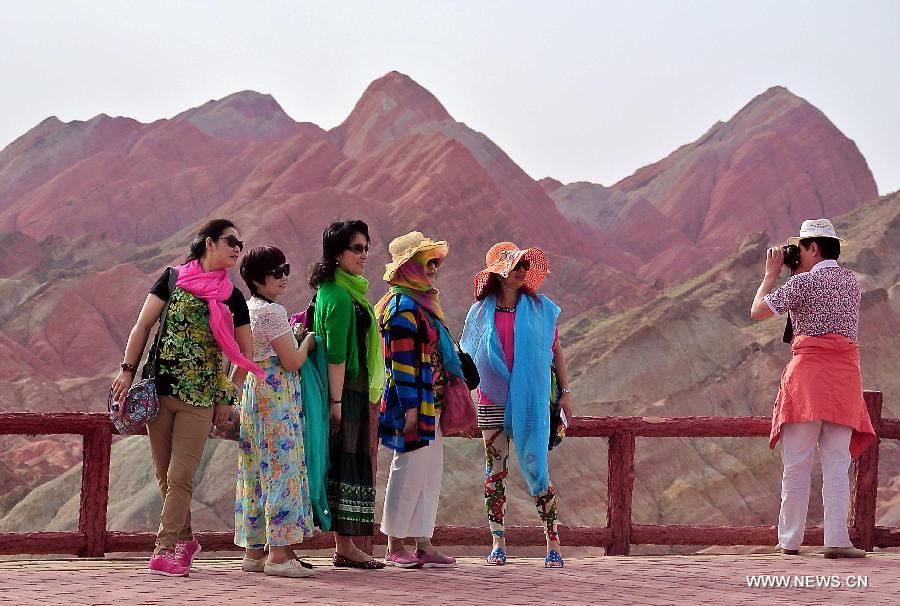 Visitors take photos at Zhangye Danxia Landform Geological Park in Zhangye City, northwest China's Gansu Province, July 7, 2014. Danxia, which means "rosy cloud", is a special landform formed from reddish sandstone that has been eroded over time into a series of mountains surrounded by curvaceous cliffs and many unusual rock formations. (Xinhua/Wang Song)