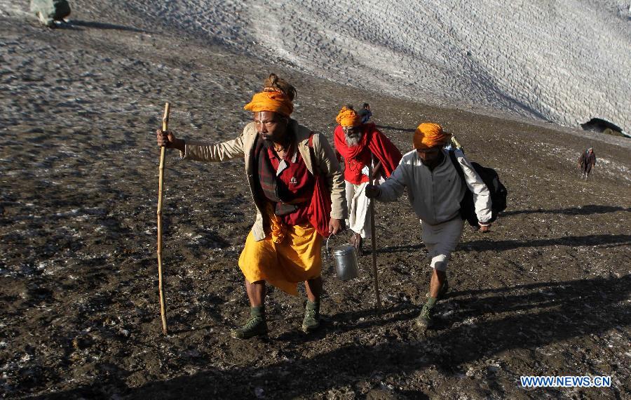 Hindu pilgrims are on their way to holy Amarnath cave near Sheshnag, south of Srinagar, Indian-controlled Kashmir, June 7, 2014. Tens of thousands Hindu pilgrims annually go to Amarnath cave which lies 3,888 meters above sea level in Indian-controlled Kashmir amid tight security. (Xinhua/Javed Dar)
