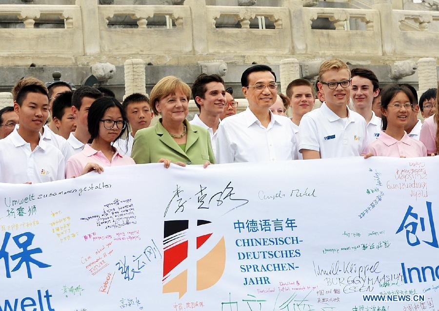 Chinese Premier Li Keqiang and German Chancellor Angela Merkel pose for a group picture with youngsters attending the closing ceremony of "the Year of Languages" program between China and Germany, an initiative meant to encourage the two peoples to study each other's language, at the Temple of Heaven, a famous scenic spot in Beijing, capital of China, July 7, 2014. (Xinhua/Li Tao)
