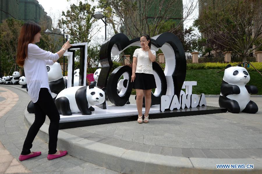 A citizen poses for photos in front of panda figures during the open-air show "1st Panda" in Shenyang, capital of northeast China's Liaoning Province, July 7, 2014. A hundred panda figures made from bamboo scraps are shown during the event, which aims at promoting environmental awareness. (Xinhua/Pan Yulong)