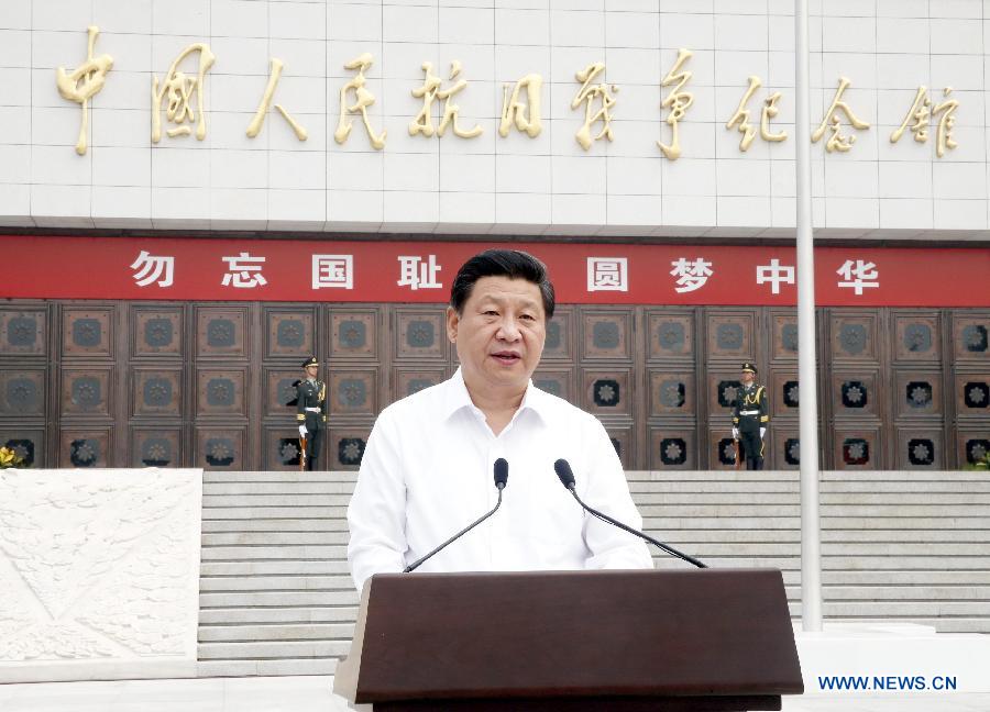 Chinese President Xi Jinping, who is also the general-secretary of the Communist Party of China Central Committee and chairman of the Central Military Commission, delivers a speech during a ceremony marking the 77th anniversary of the start of the Chinese people's war of resistance against Japanese invasion in Beijing, capital of China, July 7, 2014. (Xinhua/Ju Peng)