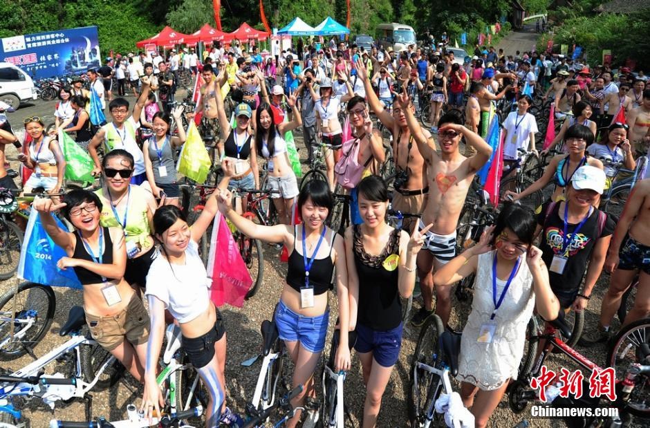 Body-painted participants from China and abroad take part in the cycling race held in Zhangjiajie, central China's Hunan province on July 5, 2014. (Photo/CNS)