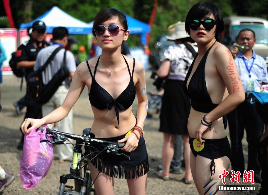 Body-painted participants from China and abroad take part in the cycling race held in Zhangjiajie, central China's Hunan province on July 5, 2014. (Photo/CNS)