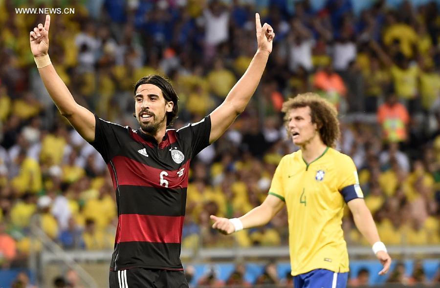 Germany's Sami Khedira (L) celebrates after scoring during a semifinal match between Brazil and Germany of 2014 FIFA World Cup at the Estadio Mineirao Stadium in Belo Horizonte, Brazil, on July 8, 2014.(Xinhua/Qi Heng)