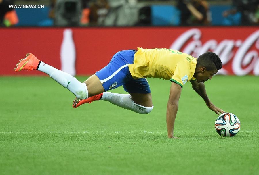 Brazil's Luiz Gustavo falls down during a semifinal match between Brazil and Germany of 2014 FIFA World Cup at the Estadio Mineirao Stadium in Belo Horizonte, Brazil, on July 8, 2014.(Xinhua/Liu Dawei)