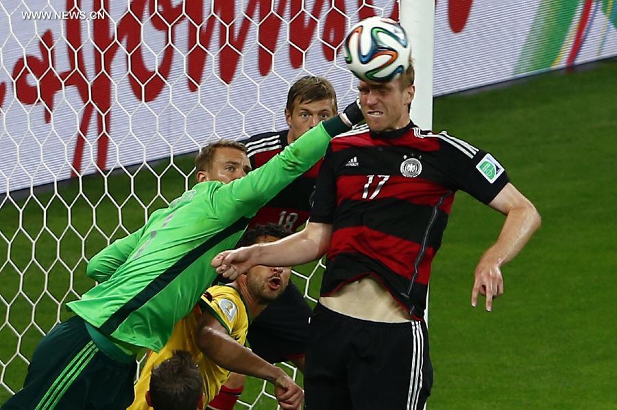 Germany's goalkeeper Manuel Neuer (L, front) and Per Mertesacker (R) save the ball during a semifinal match between Brazil and Germany of 2014 FIFA World Cup at the Estadio Mineirao Stadium in Belo Horizonte, Brazil, on July 8, 2014.(Xinhua/Liu Bin)