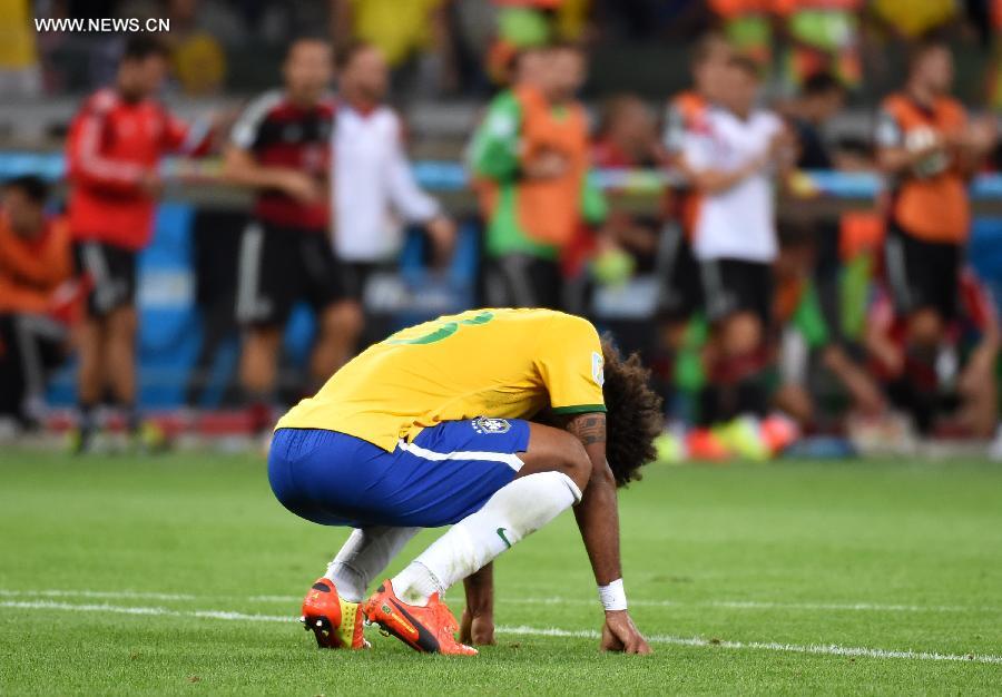 Brazil's Dante reacts after a semifinal match between Brazil and Germany of 2014 FIFA World Cup at the Estadio Mineirao Stadium in Belo Horizonte, Brazil, on July 8, 2014. Germany won 7-1 over Brazil and qualified for the final on Tuesday.(Xinhua/Li Ga)