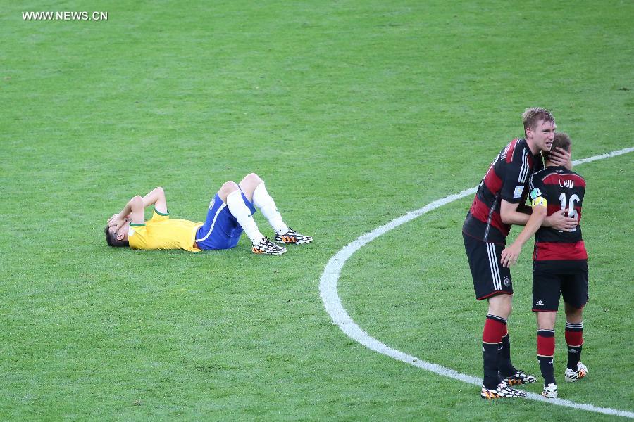 Brazil's Oscar (L) lies on the field after a semifinal match between Brazil and Germany of 2014 FIFA World Cup at the Estadio Mineirao Stadium in Belo Horizonte, Brazil, on July 8, 2014. Germany won 7-1 over Brazil and qualified for the final on Tuesday.(Xinhua/Li Ming)
