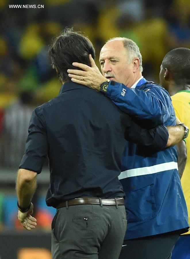 Brazil's coach Luiz Felipe Scolari (C) greets Germany's coach Joachim Loew after a semifinal match between Brazil and Germany of 2014 FIFA World Cup at the Estadio Mineirao Stadium in Belo Horizonte, Brazil, on July 8, 2014. Germany won 7-1 over Brazil and qualified for the final on Tuesday. (Xinhua/Liu Dawei)