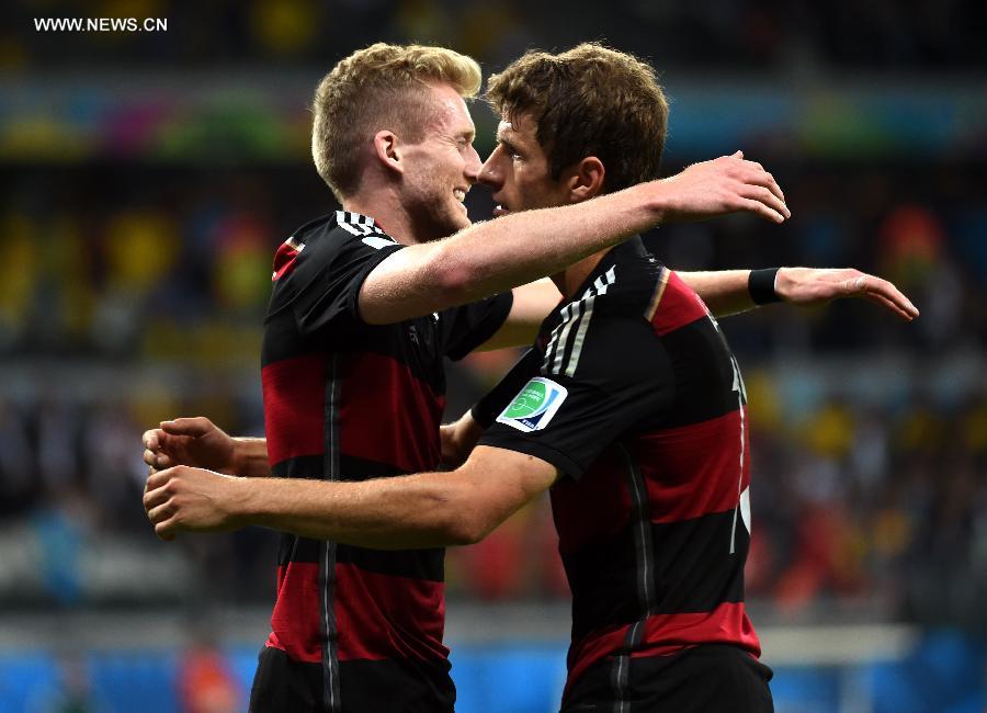 Germany's Thomas Muller (R) celebrates a goal during a semifinal match between Brazil and Germany of 2014 FIFA World Cup at the Estadio Mineirao Stadium in Belo Horizonte, Brazil, on July 8, 2014. Germany won 7-1 over Brazil and qualified for the final on Tuesday.(Xinhua/Li Ga)