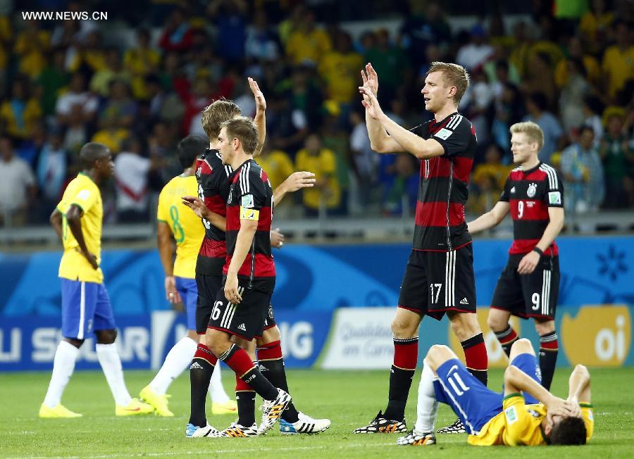 Germany's players celebrate the victory after a semifinal match between Brazil and Germany of 2014 FIFA World Cup at the Estadio Mineirao Stadium in Belo Horizonte, Brazil, on July 8, 2014. Germany won 7-1 over Brazil and qualified for the final on Tuesday.(Xinhua/Chen Jianli)