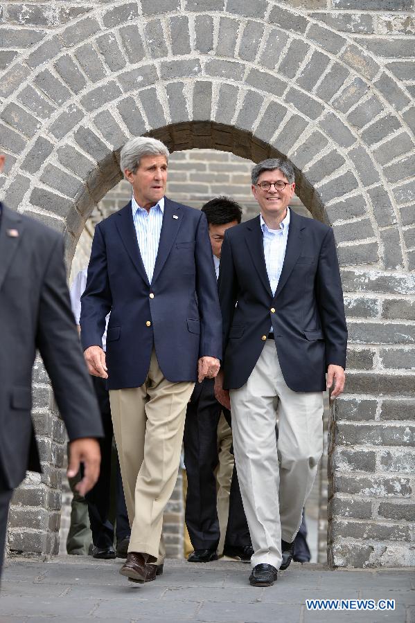 U.S. Secretary of State John Kerry (L) and Secretary of the Treasury Jacob Lew pay a visit to the Badaling Great Wall in Beijing, capital of China, July 8, 2014. Kerry and Lew visited the Badaling Great Wall on Tuesday, along with U.S. Ambassador to China Max Baucus. Kerry and Lew are in Beijing for the upcoming sixth China-U.S. Strategic and Economic Dialogue (S&ED), to be held in Beijing on July 9 and 10. (Xinhua/Li Xin)