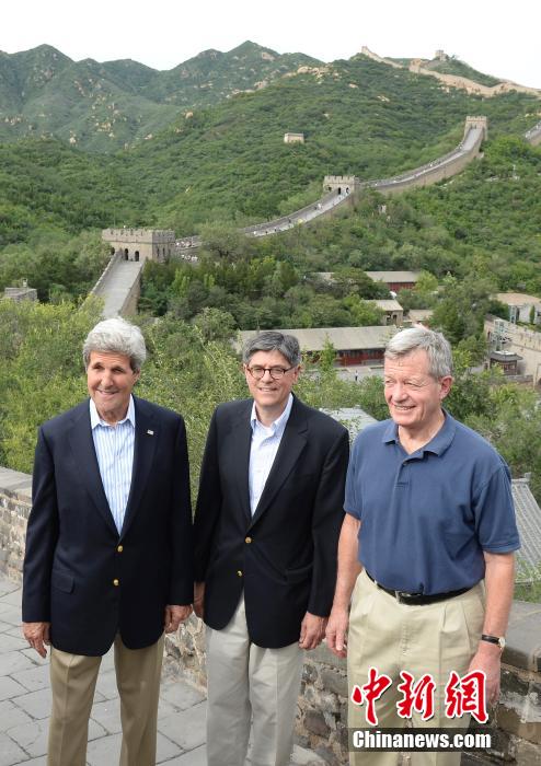 U.S. Secretary of State John Kerry (L) and U.S. Treasury Secretary Jacob Lew (M) visit Badaling Great Wall in Beijing, July 8. They are accompanied by U.S. ambassador to China Max Baucus (R). (CNS/Hou Yu)