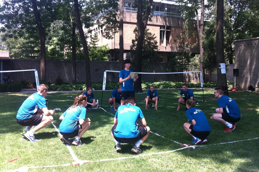 The Danish Badminton Inspiration Team stages a show during the break of their friendly match with Chinese social media users on the outdoor badminton courts at the Danish Embassy in Beijing July 8, 2014. (Photo/People’s Daily Online)