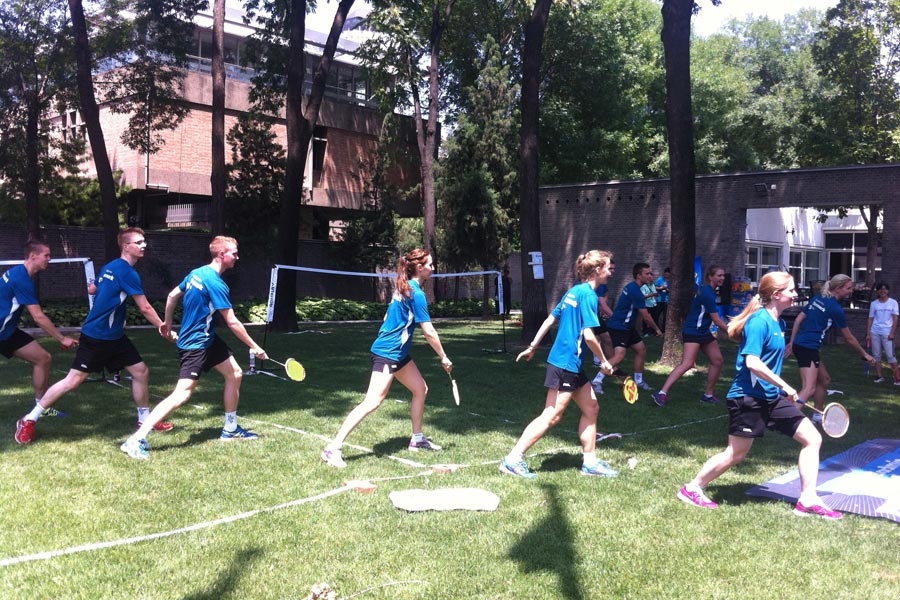 The Danish Badminton Inspiration Team stages a show during the break of their friendly match with Chinese social media users on the outdoor badminton courts at the Danish Embassy in Beijing July 8, 2014. (Photo/People’s Daily Online)