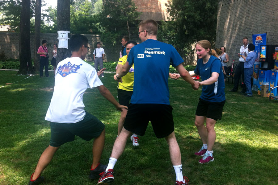 The Danish Badminton Inspiration Team plays warm-up games before the friendly match with Chinese social media users on the outdoor badminton courts at the Danish Embassy in Beijing July 8, 2014. (Photo/People’s Daily Online)