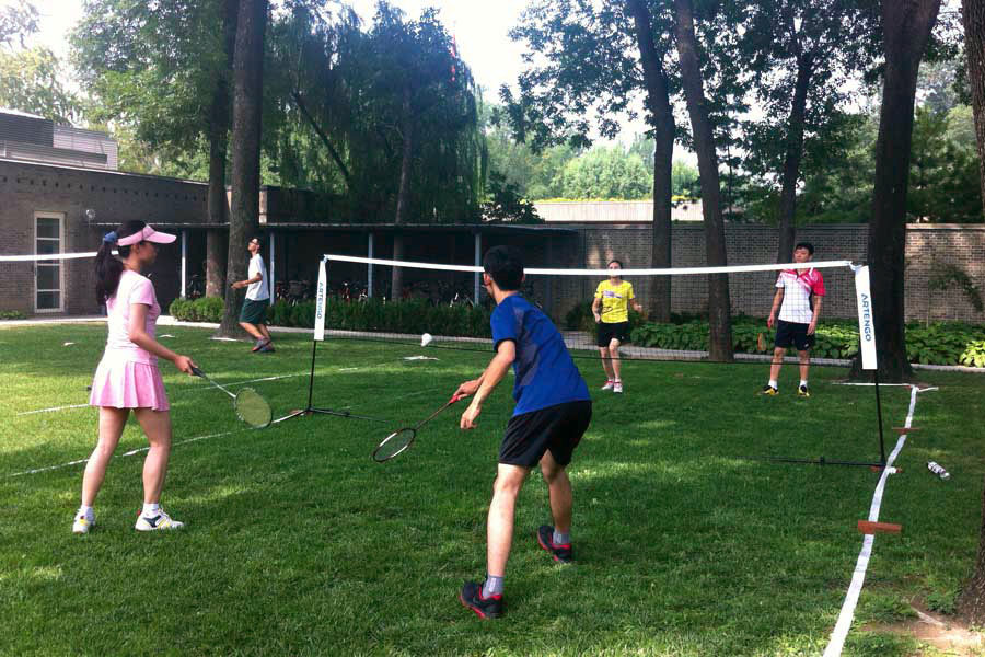 Chinese social media users warm up before the friendly match with the Danish Badminton Inspiration Team on the outdoor badminton courts at the Danish Embassy in Beijing July 8, 2014. (Photo/People’s Daily Online)