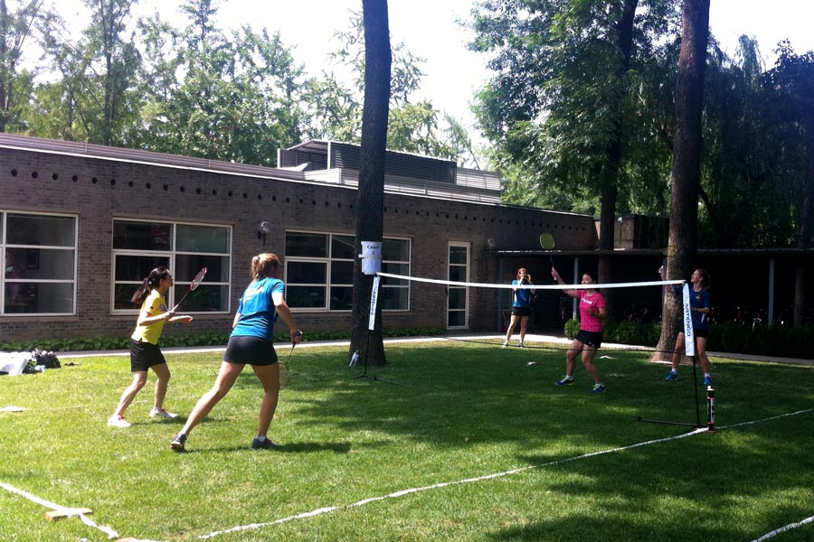 The Danish Badminton Inspiration Team plays a friendly match with Chinese social media users on the outdoor badminton courts at the Danish Embassy in Beijing July 8, 2014. (Photo/People’s Daily Online)